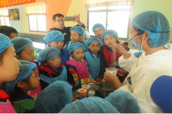 生生牧場(chǎng)工作人員為新華小記者現(xiàn)場(chǎng)教授酸奶制作全過(guò)程